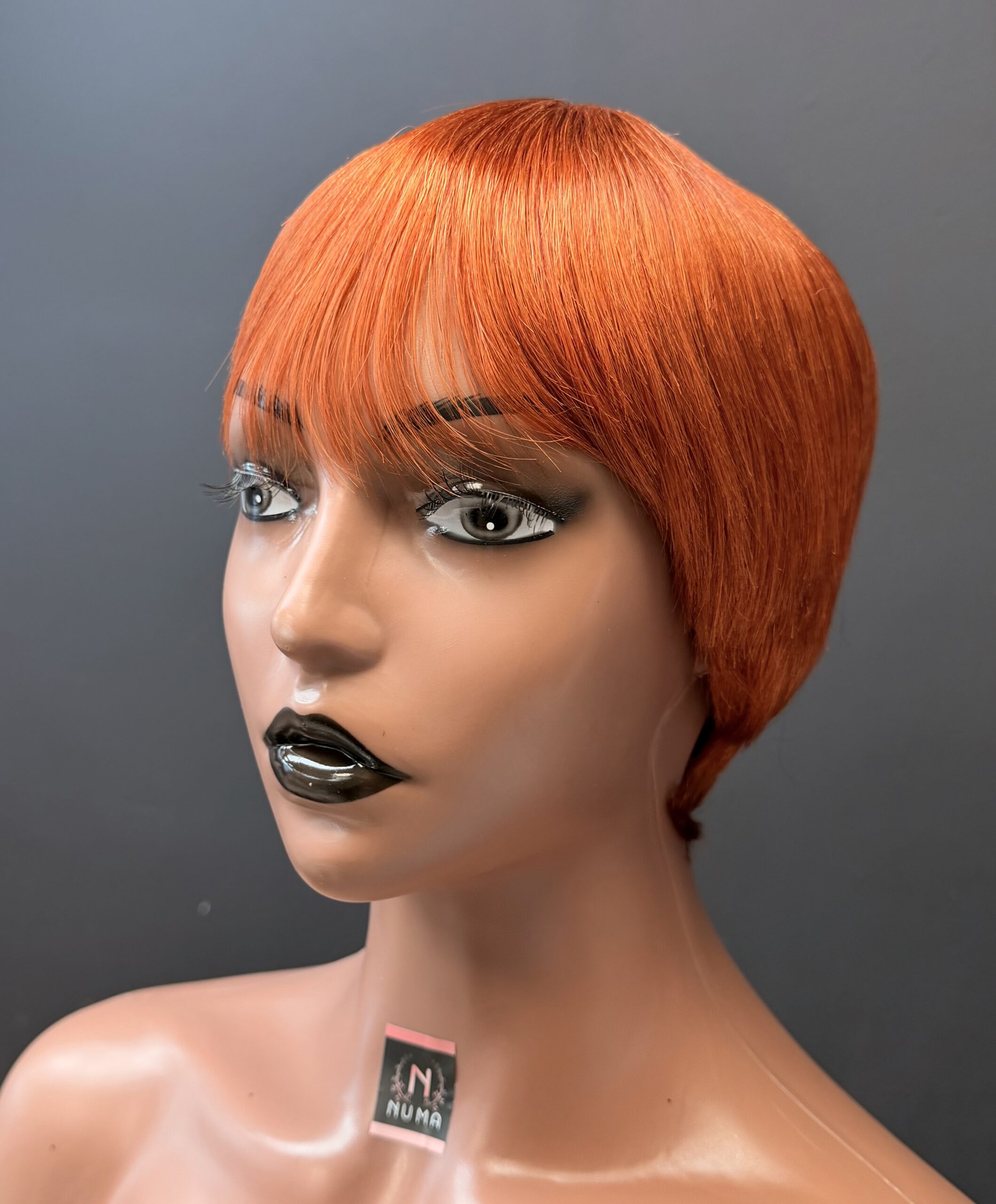 Ginger-colored skull cap wig made with human hair.